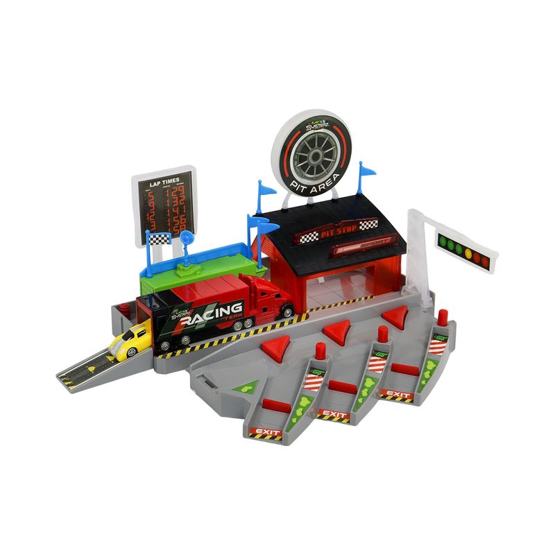 - Contenido del paquete: Playset de boxes con múltiples accesorios y vehículos en miniatura
