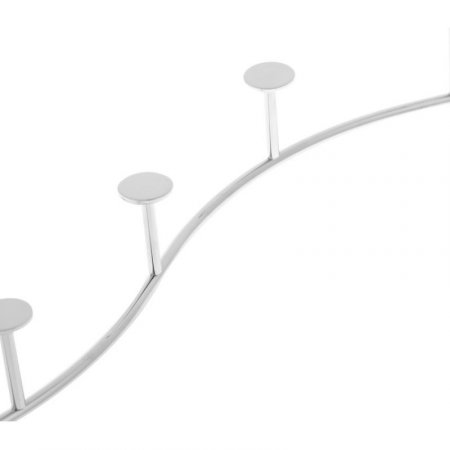 Material: Metal. Perchero con diseño de curvas. Ideal para montar en la pared con tornillos. Permite colgar hasta 5 elementos. Ideal para toallas. Acabado cromado.