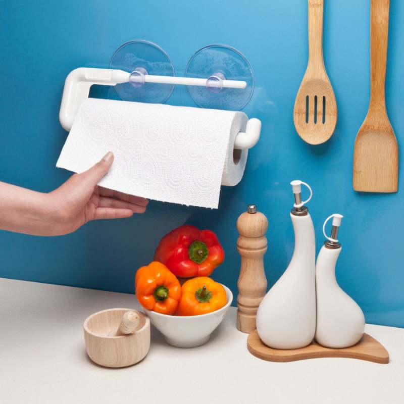 porta papel cocina con ventosas adherentes, de facil uso y practico.
