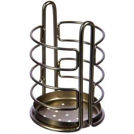 Material: Níquel. Soporte para Utensilios de Cocina. Base circular. Orificios en la base que permite el paso del agua. 4 Topes antideslizantes. Estructura Resistente.