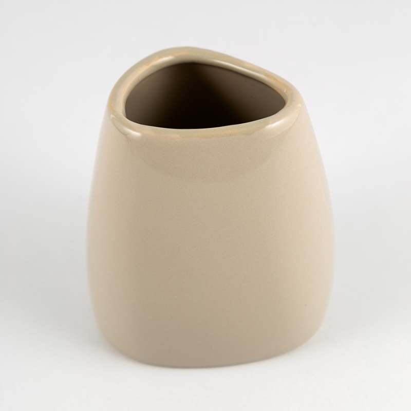 Portacepillo de cerámica en color taupe, con dimensiones de 8x9 cm, con un diseño elegante y funcional.