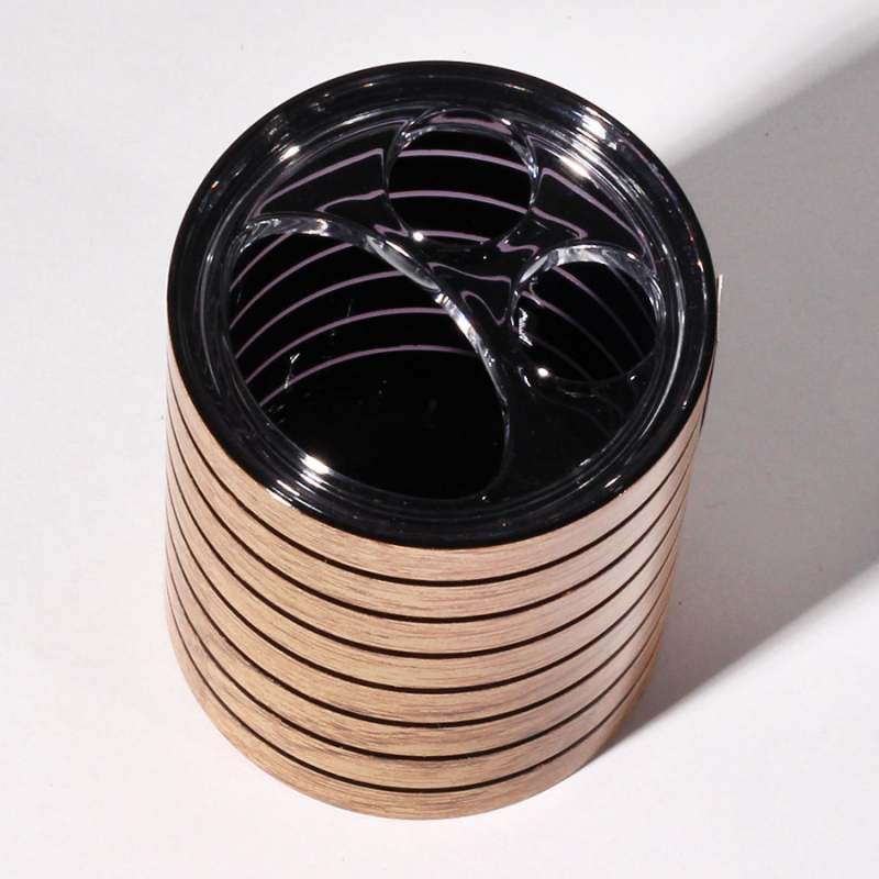 Organizador  en acrílico, diseño redondo tipo madera. Tiene tapa con tres orificios. Práctico, duradero y resistente.