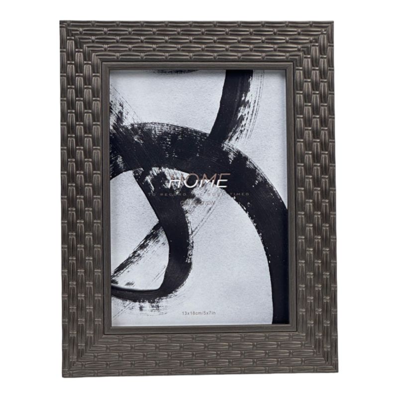 Portarretrato con acabado negro y textura tipo entramado en relieve, formato para fotografía 5x7”, medidas 18x23 cm, ideal para decorar espacios modernos