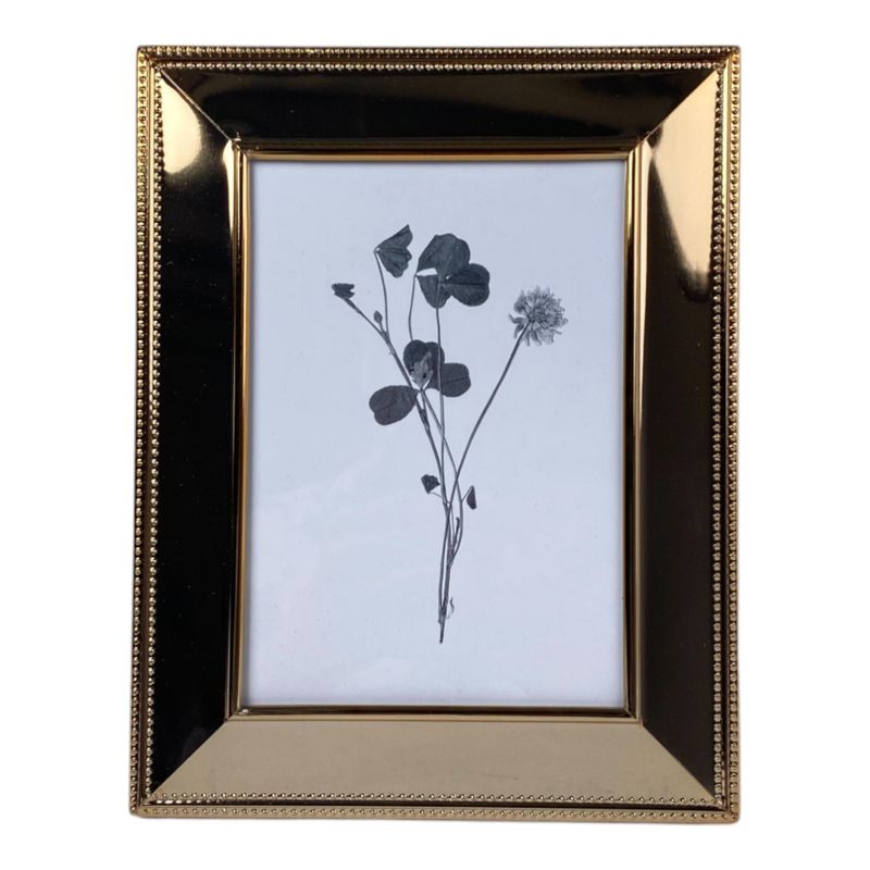 Portarretrato 8x10 en acero color dorado con marco brillante y detalles en relieve, medidas 18x23 cm, pieza decorativa que enmarca fotografías especiales y añade un acento sofisticado a mesas, consolas o espacios interiores.