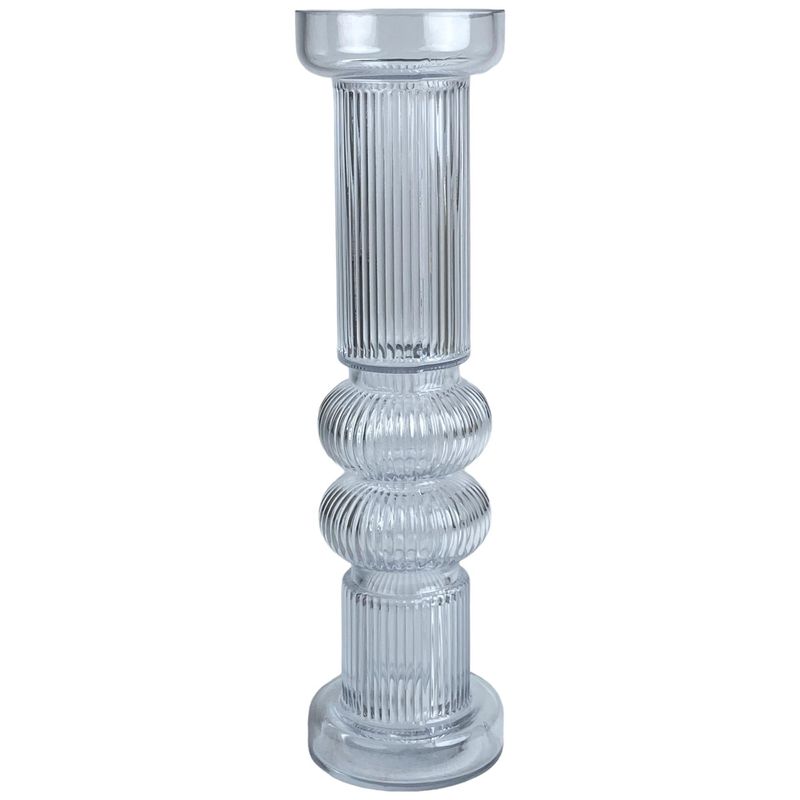 Portavela en vidrio transparente con diseño estilizado tipo Aura y acabado texturizado, medidas 9x33x9 cm, ideal para velas decorativas, para aportar altura, elegancia y luminosidad a mesas, comedores o espacios especiales.