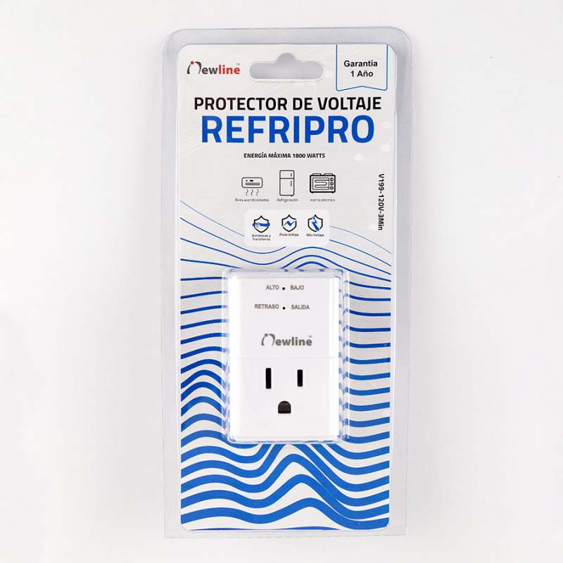 Potencia: 1800w Maximo Voltaje: 120VAC Corriente Maxima: 15A Protector Refripro 120VAC según norma RETIE Protección y supresión de picos de voltaje. Temporización automática de 1 a 5 minutos No es un regulador de voltaje. Temporizador de encendido, desconexión por bajo y sobre voltaje Diseñado especialmente para proteger equipos de refrigeración, aire acondicionado, entre otros de altibajos de voltaje.