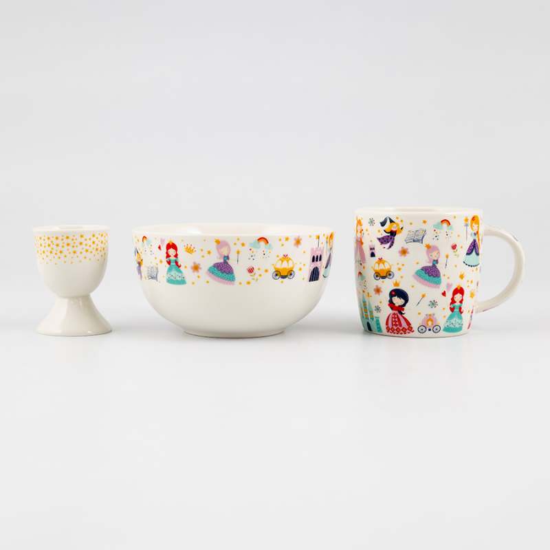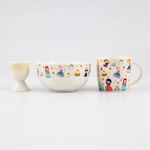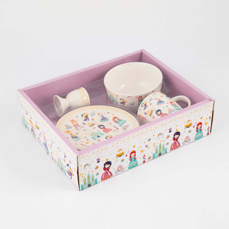 PUESTO DE DESAYUNO 4 PIEZAS EN CERAMICA 1 PLATO 1 MUG TAZA 1 PORTA HUEVO 1 BOWL TAZON DISEÑO PRINCESAS EMPAQUE CAJA EN PVC