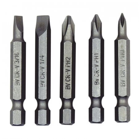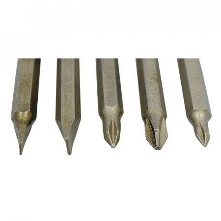 Juego de 5 puntas, espiga hexágonal de 1/4'. Incluye: 2 puntas planas de 3/16', 1/4' y 3 puntas estrella de #0, #1, #2. Largo de 2' (50mm).
