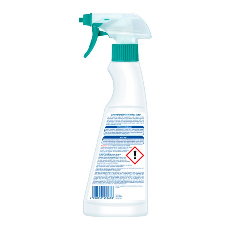Funciona eliminando y previniendo las difíciles manchas de desodorante y sudor. Con el tiempo los residuos de desodorantes y sudor producen manchas permanentes y olores encerrados en las fibras. Ambos no se pueden quitar con quitamanchas multiusos y son cada vez más intensos en cada puesta. La fórmula anti-desodorante y anti-sudor de Dr. Beckmann elimina eficazmente todos los residuos. La fórmula es suave para los colores y las fibras, y por lo tanto se puede utilizar en ropa blanca y de color. 1.- Humedezca bien la mancha y deje trabajar durante 10 minutos, para manchas permanentes hasta 30 minutos. No deje que se seque. 2.- Luego lave normalmente. Si se usa antes de cada lavado el Quitamanchas Desodorante y Sudor, impedirá la formación de nuevos residuos y olores. elimina eficazmente todos los residuos. La fórmula es suave para los colores y las fibras, y por lo tanto se puede utilizar en ropa blanca y de color.