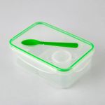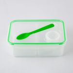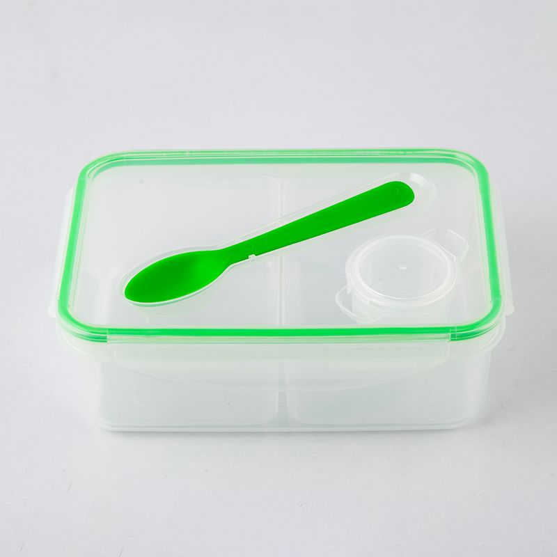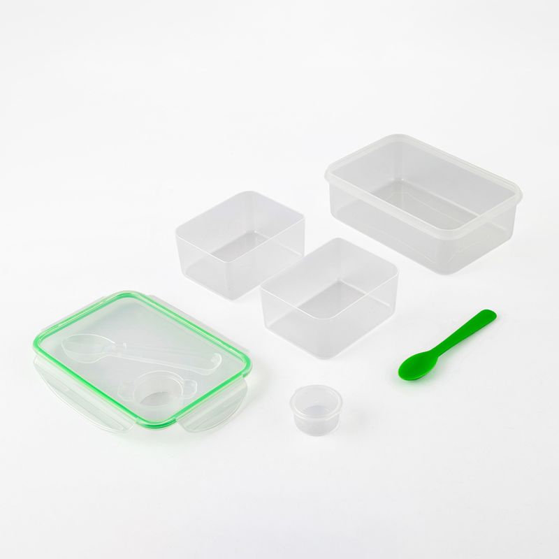 Fabricado en plástico de alta resistencia y libre de BPA, este contenedor ofrece una solución versátil y segura para el transporte y organización de alimentos. Su diseño translúcido con detalles en color verde cuenta con un sistema de cierre hermético mediante pestañas laterales y un empaque de silicona que previene filtraciones. El conjunto incluye tres compartimentos internos de plástico removibles, un recipiente pequeño con tapa para aderezos y una cuchara que se integra en la tapa principal. Con una capacidad total de 1.5 litros, es el accesorio ideal para mantener una dieta balanceada en el trabajo, la escuela o viajes.