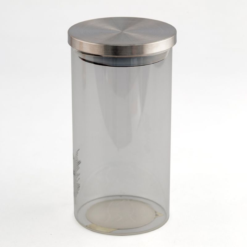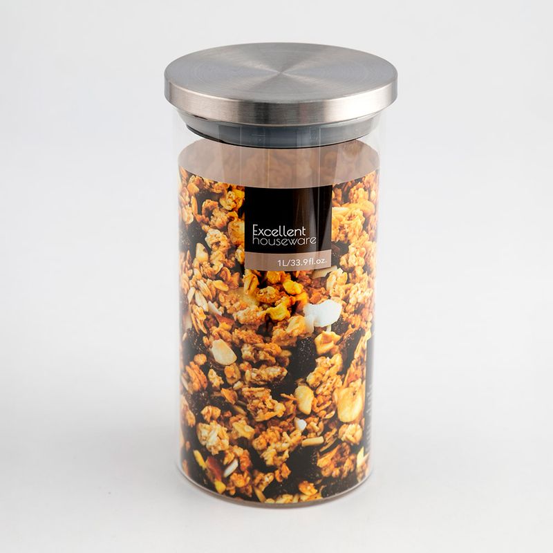 Fabricado en vidrio de alta resistencia con un diseño cilíndrico que permite una visibilidad total del contenido, facilitando la organización de la cocina. Incluye una tapa con acabado metálico cepillado que proporciona un cierre seguro para mantener la frescura de los alimentos. Gracias a su capacidad de 1 litro, es un accesorio versátil e higiénico, ideal para almacenar cereales, granos, pastas cortas o frutos secos.