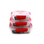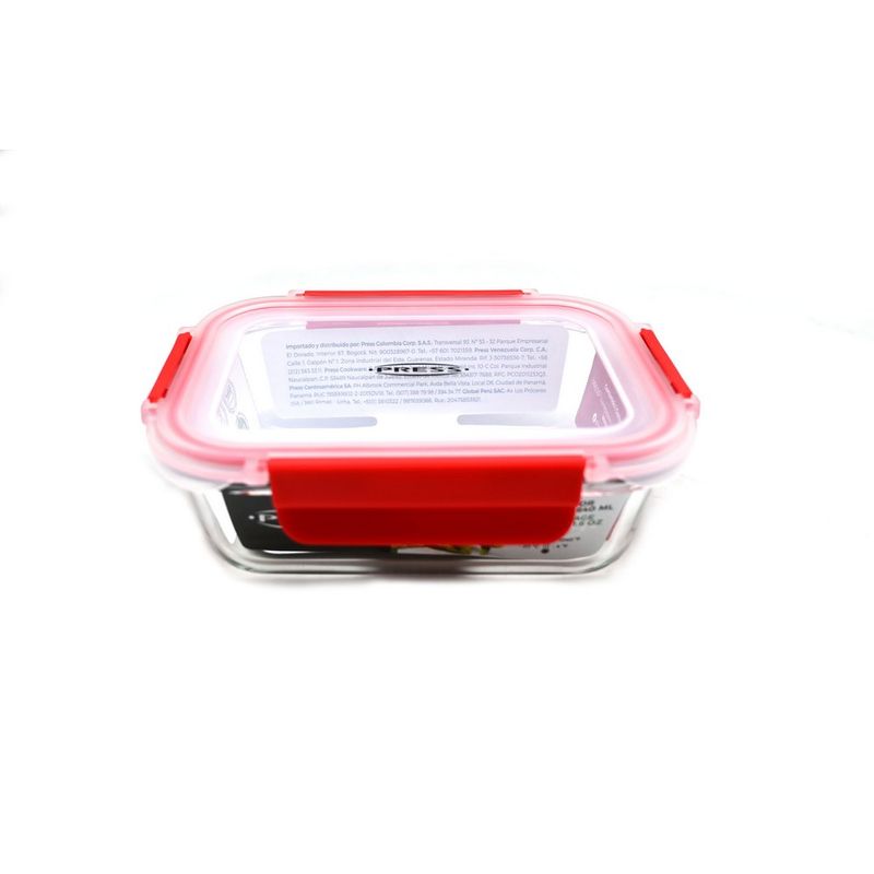 Contenedor en vidrio de borosilicato con tapa de polipropileno. Color transparente con clic en rojo. Tiene capacidad de 640 ml. Resiste -20 grados y hasta 560 grados. Son libres de pfoa.
