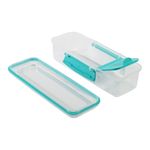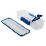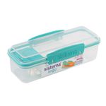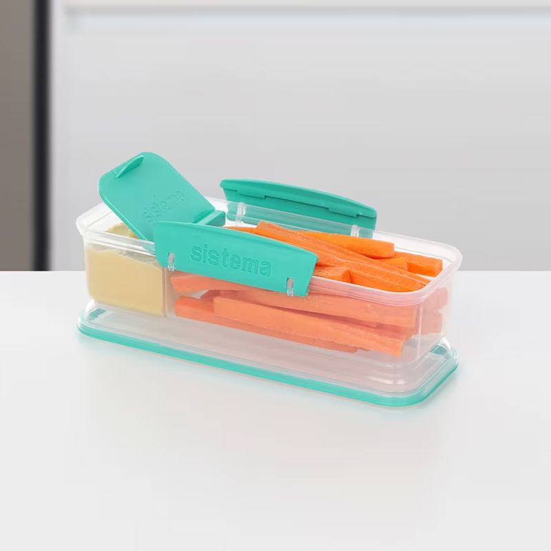 Este contenedor rectangular destaca por su diseño funcional de dos compartimentos internos, ideal para separar alimentos y mantener su frescura. Cuenta con una división principal para snacks o vegetales y un compartimento lateral más pequeño con su propia tapa individual, perfecto para aderezos, dips o frutos secos. Su sistema de cierre incluye clips laterales de seguridad y un sello flexible en la tapa principal que garantiza un transporte seguro, siendo una opción compacta y práctica para la lonchera o el bolso. Contenido: 1 Recipiente rectangular con división interna. 1 Tapa principal con clips de seguridad. 1 Tapa pequeña interna para el compartimento de aderezos. Recomendaciones: Lavar con agua y jabón suave antes del primer uso. Gracias a su tapa interna adicional, es ideal para llevar hummus o salsas sin que se mezclen con el resto del contenido. Se recomienda asegurar que ambos clips laterales estén correctamente encajados antes de guardar el recipiente en posición vertical u horizontal.