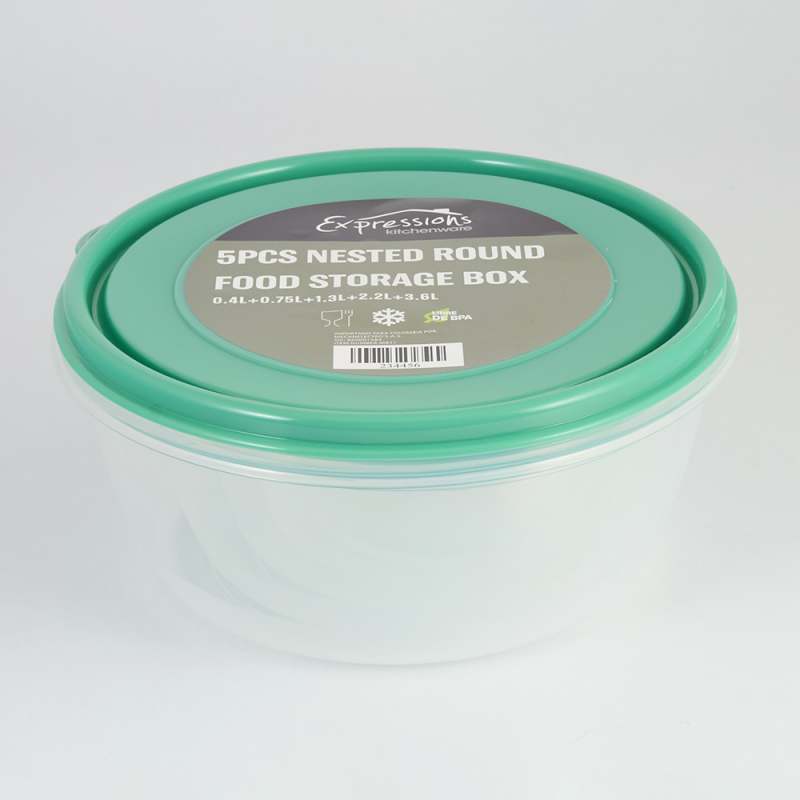 Recipientes Expressions Set 5 Unidades Transparente Plástico. Set de 5 recipientes redondos fabricados en plástico resistente, con cuerpo transparente y tapa verde con capacidad de 0.4 l, 0.75 l, 1.3 l, 2.2 l y 3.6 l respectivamente. Ideales para conservar y almacenar alimentos de forma segura. Su diseño apilable y anidable permite ahorrar espacio en la cocina. Aptos para refrigerador y fáciles de limpiar, perfectos para uso diario en el hogar u oficina.