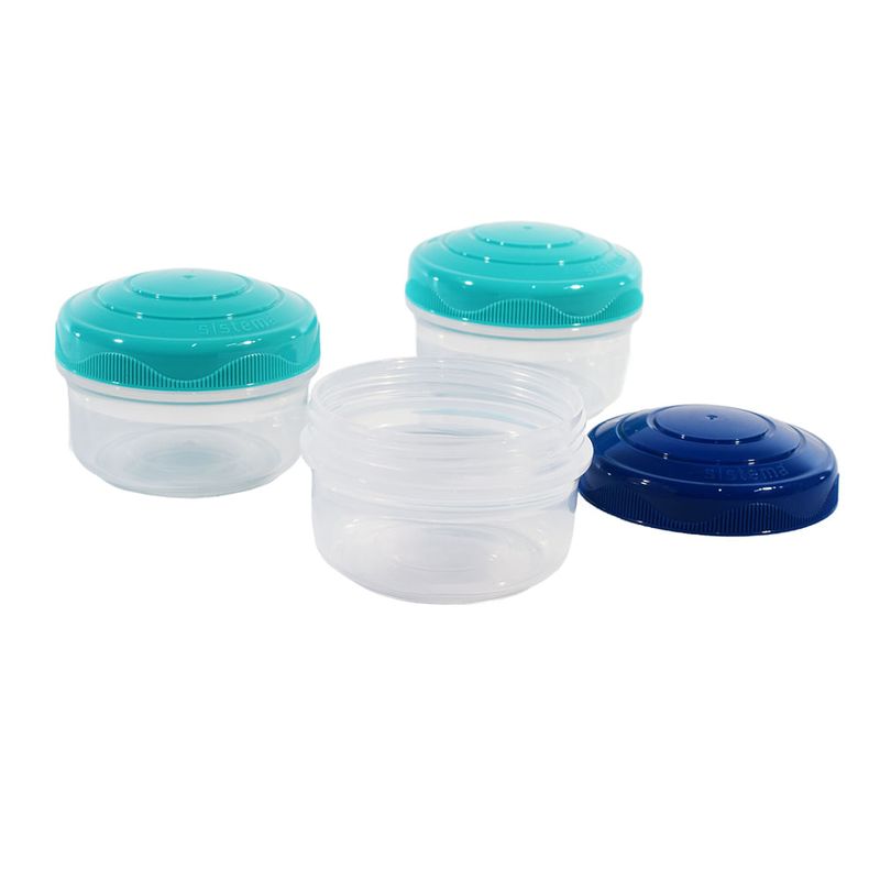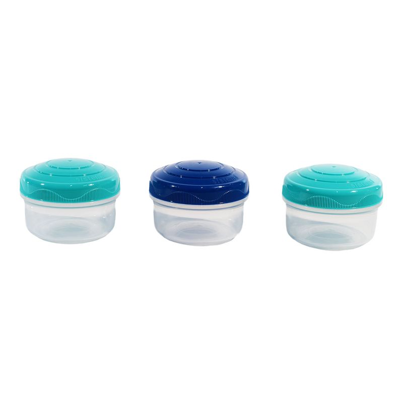 Este set incluye tres contenedores compactos y livianos, diseñados especialmente para el transporte de snacks, frutas, yogur o aderezos de manera organizada. Cuentan con tapas de rosca en colores vivos que incorporan un cierre hermético, lo que permite transportar líquidos con seguridad y mantener la frescura de los alimentos por más tiempo. Su tamaño es ideal para llevar en mochilas, bolsos, loncheras o en el portavasos del auto.