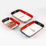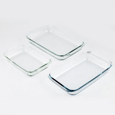 Set de 3 refractarias rectangulares de 2.9 + 2.2 + 1.6 litros de medidas: 39.2x23.6x5.2 cm - 34.5x21x5.1 cm - 29.6x17.9x5 cm, en vidrio de alto borosilicato. Los materiales del producto son inodoros, saludables y duraderos. Pl4+Pl5+Pl6