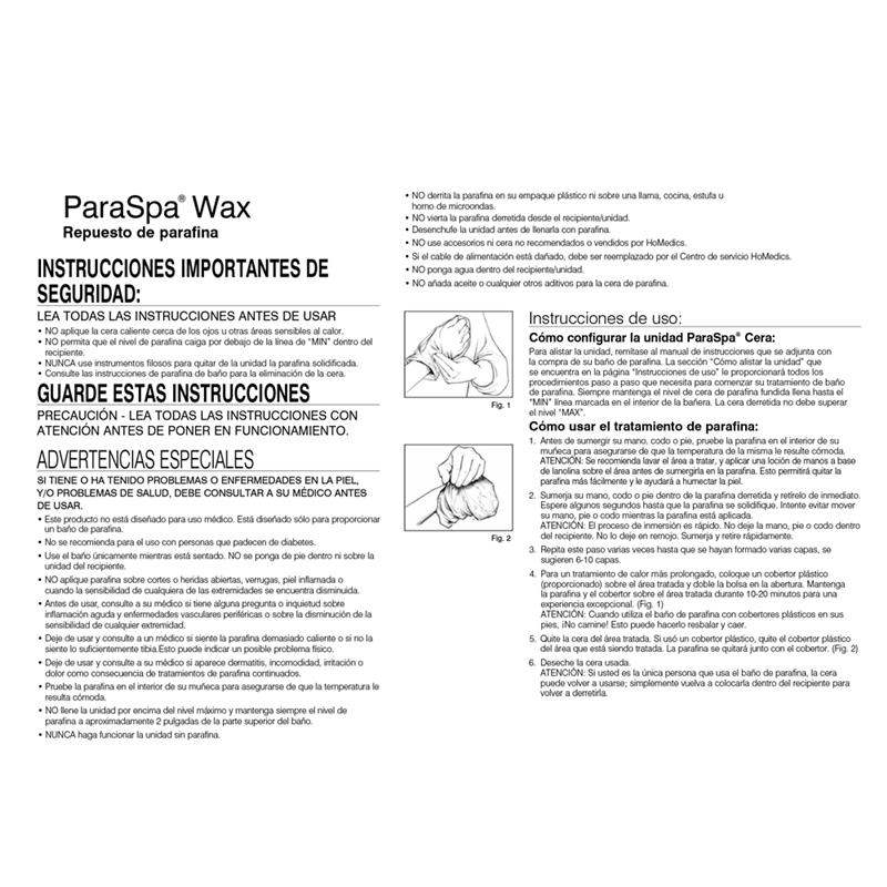 set de 2 piezas para Spawax, contiene repuestos de parafina, este incríble set incluye 20 cobertores plásticos ideales para trabajar o usar en casa para mantener tu cerpo en buena forma. Estas piezas son Hipo alergénica para el cuidado de tu salud y bienestar, No contiene colorantes ni perfumes que irritan la piel así que puedes usarlo en pieles sensibles, Piel bella sin necesidad de costosos tratamientos de hidromasaje, Cada bolsa es de 450g, Fácil y cómoda. Advertencia: No se recomienda para el uso con personas que padecen de diabetes, No aplique parafina sobre cortes o heridas abiertas, Antes de usar consulte al médico, Pruebe la parafina en el interior de su muñeca para verificar la temperatura, No añada aditivos a la parafina, Nunca use el producto si está en la cama. Repuesto para usar solo con spa de parafina HoMedics®. Este producto incluye dos paquetes de 1 libra de cera de parafina pura hipoalergénica y 20 revestimientos de plástico. Sin aromas ni colorantes que irriten la piel sensible, los paquetes convenientes de 1 libra están disponibles para que pueda rellenarlos según sea necesario sin problemas.No apto para diabéticos, personas con marca pasos o mujeres en estado de embarazo, Previo concepto medicoUso doméstico. Set de dos repuestos de parafina. Incluye 20 cobertores plásticos, Hipo alergénica. No contiene colorantes ni perfumes que irritan la piel. Cada bolsa es de 450g, Fácil y cómodas.