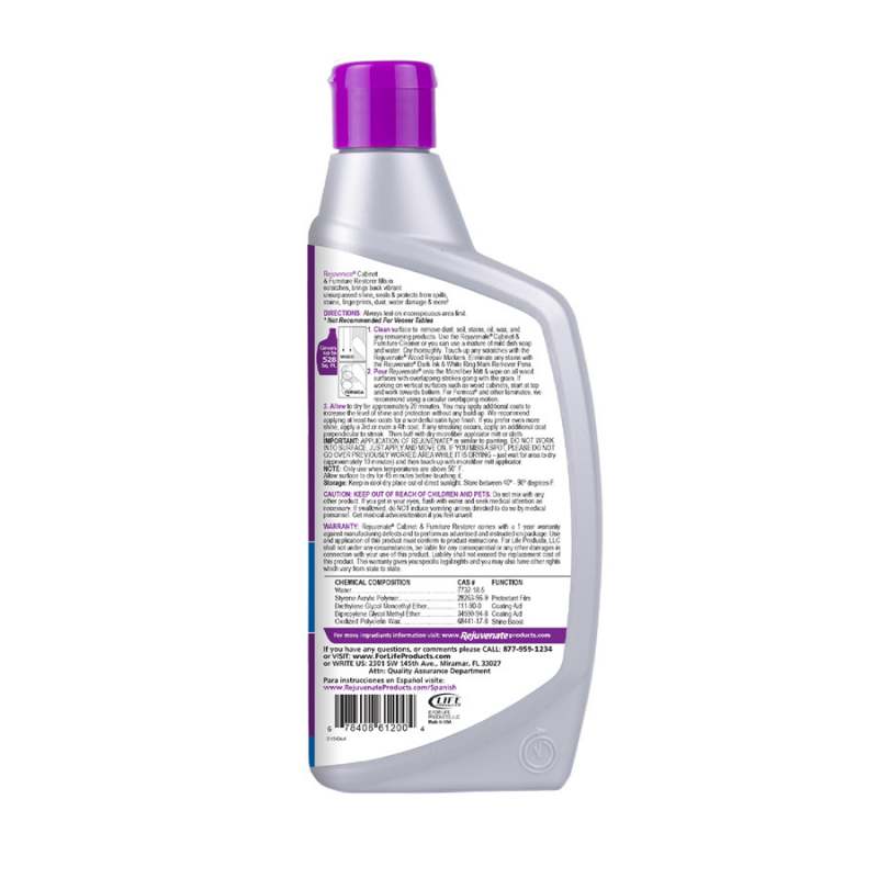El Restaurador de Muebles y Gabinetes Rejuvenate, renueva madera previamente selladas y terminadas, formaica y superficies laminadas. Con el restaurador Rejuvenate puedes renovar: gabinetes de cocina, gabinetes de baño, muebles de madera y paneles de pared. La fórmula del Renovador de muebles Rejuvenate es a base de agua y polímeros para rellenar rayones, restaurar el brillo, sellar lechadas y proteger los armarios y muebles de nuevos rayones y daños causados por agua. El restaurador de muebles y armarios crea una barrera protectora contra los dañinos rayos UV del sol. El Restaurador de muebles Rejuvenate es de fácil aplicación con paños o aplicadores de microfibra. Evita que el polvo, la mugre y el pelo queden atrapados en su nuevo acabado.