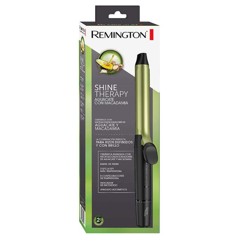 Rizadora shine therapy Marca: remington. Medidas: 36cm x 12,70cm x 6cm. Barril de 25mm recubierto de cerámica con aguacate y macadamia. Temperatura máxima de 210°C. 8 ajustes de temperatura: 140°C, 150°C, 160°C, 170°C, 180°C, 190°C, 200°C, 210°C Apagado automático. Indicador de encendido. Cable de 1.8m