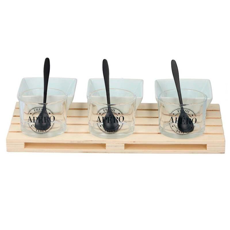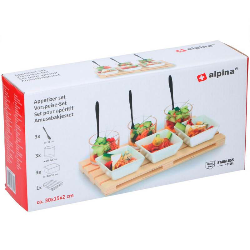 Salseras 10 piezas. Marca: Alpina. Medidas: 30x15x2cm. Material: bandeja en madera. Capacidades: 210 y 220ml. Peso: 0,985Kg. Incluye: 1 bandeja de madera, 6 salseras, 3 cucharas. Atributos adicionales: Diseño ergonomico. Facil de usar. Sirve para servir cualquier tipo de comida. Facil de limpiar