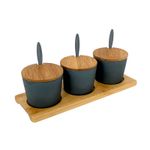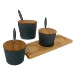 Salseras con tapa. Marca: Concepts. Medidas: 25,6x9,1x8,2cm. Material: 40%Bambu, 30% fibramaiz, 30% melamina.Capacidad: 390ml. Color: Gris oscuro y cafe. Incluye: 3 saleras, 3 tapas, 3 cucharas y 1 base. Referencia: 085-292843