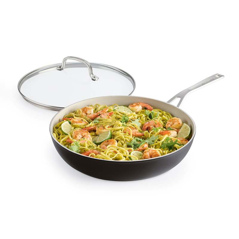 Sartén con Tapa 31 cm, Color Negro, elaborado en aluminio forjado ofrece una conducción de calor rápida y uniforme para un rendimiento superior, con recubrimiento cerámica antiadherente. Tapa de vidrio templado resistente a roturas y altas temperaturas retienen el calor y la humedad sin perder calor, ni sabor. Mango y asas con doble capa en acero inoxidable. Hacer un adecuado uso en el horno hasta la temperatura indicada para el producto o parte de este. Apto para cocinas: Gas, eléctricas, vitrocerámica y horno hasta 260 °C, Tapa vidrio templado hasta 176°C. Libre de: Pas, Bpa, Plomo y Cadmio. No Apta para: - Otros usos diferentes a la cocción y preparación de alimentos. - No exponer a sobrecalentamiento por el uso de los productos con una fuente de calor incompatible o nivel excesivo. - No use productos químicos o limpiadores abrasivos. - Evite el uso de utensilios metálicos o inadecuados con borde afilado.