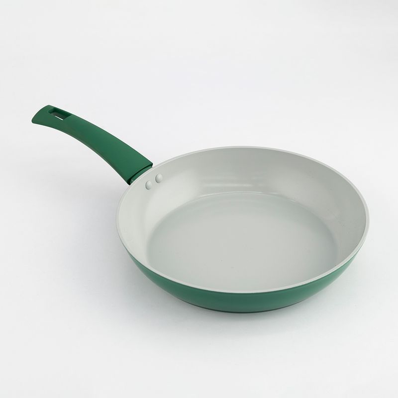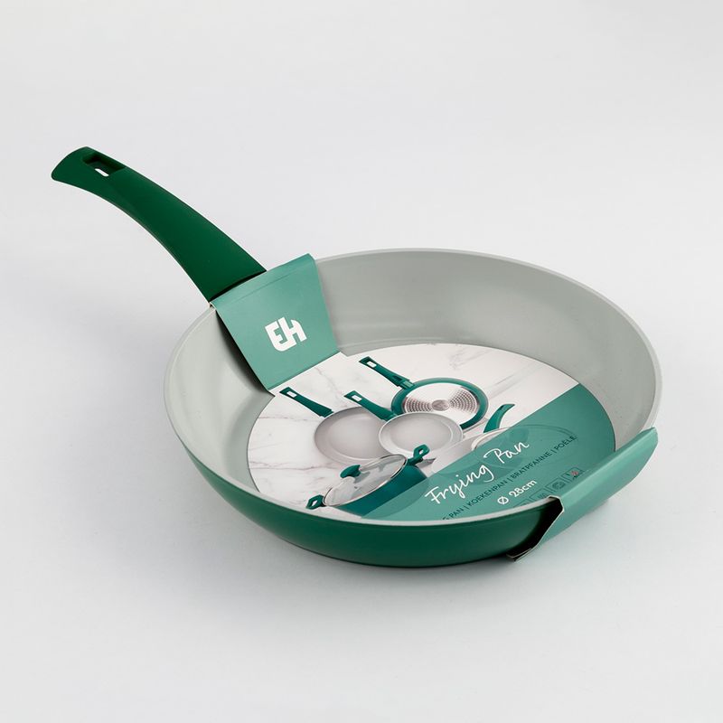 Sartén Excellhouse 28 cm verde aluminio. Fabricado en aluminio de alta calidad que facilita la cocción de los alimentos sin que se peguen y permite una limpieza rápida. Este material destaca por ser ligero y calentar rápidamente, optimizando el tiempo en la cocina. Su diseño moderno en color verde cuenta con un mango ergonómico que proporciona un agarre cómodo y seguro durante su uso.
