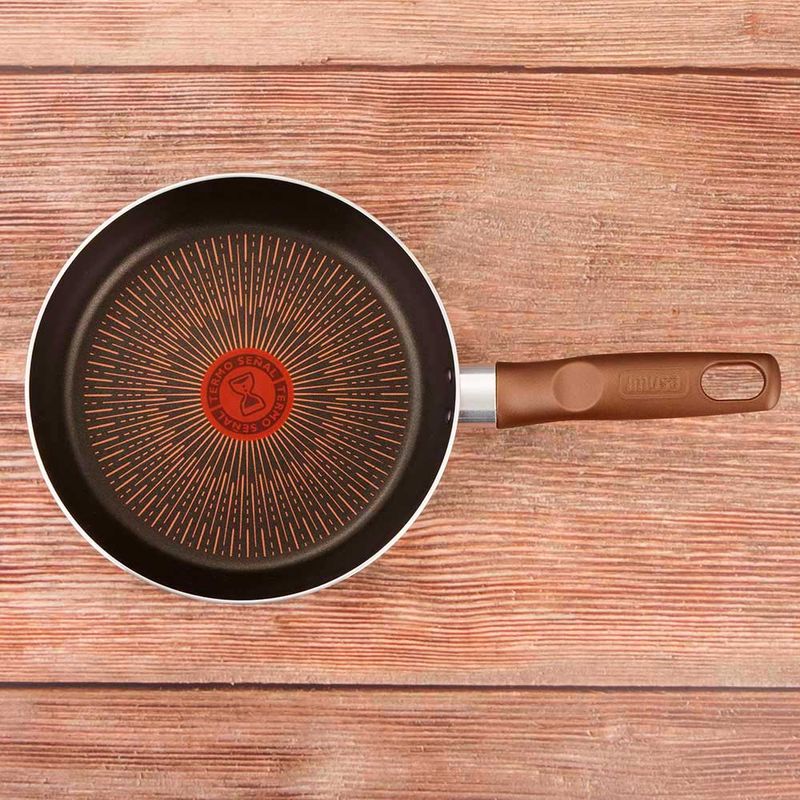 Recomendaciones: Espere a que la Termo Señal cambie a color rojo sólido antes de introducir los alimentos para conservar mejor sus texturas y nutrientes. Gracias a su mango ergonómico Seven, podrá manipular la sartén con total seguridad y comodidad durante el uso diario. Se recomienda utilizar utensilios de silicona o madera y esponjas no abrasivas para prolongar la vida útil del certificado antiadherente.
