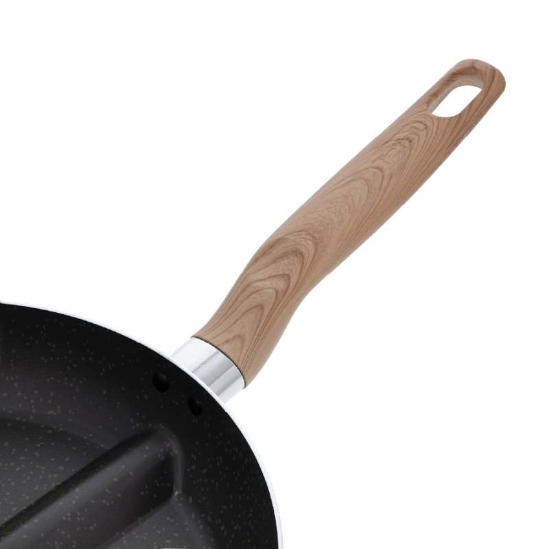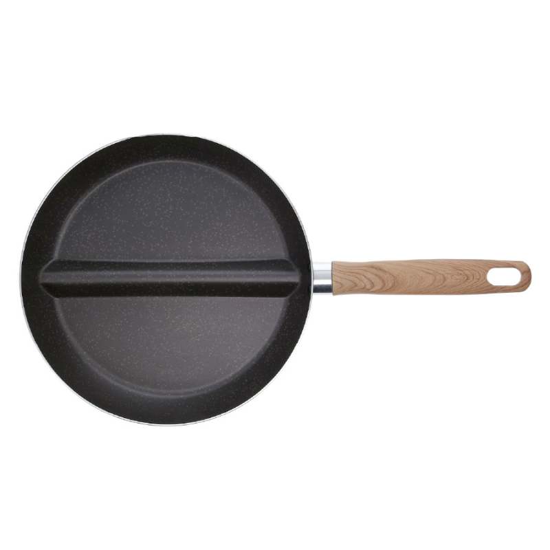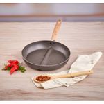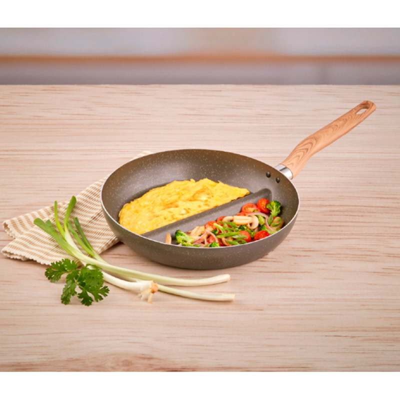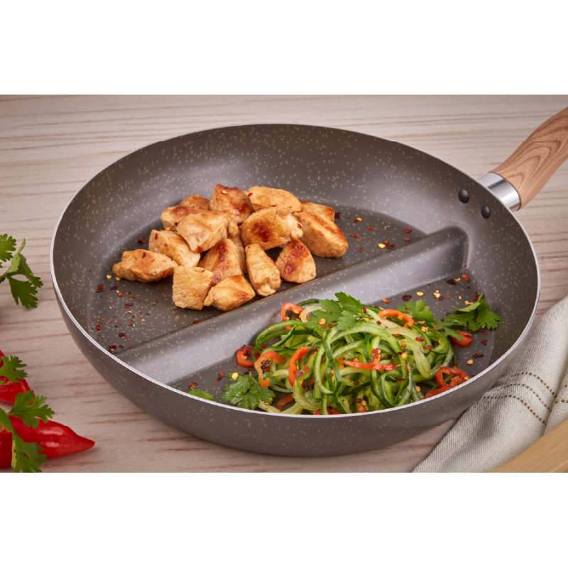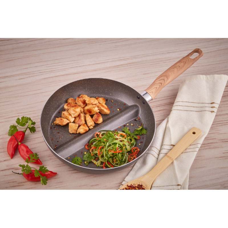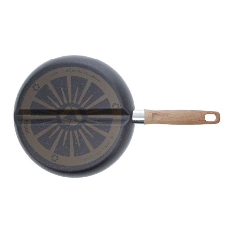 El sartén dividido de línea Natural Stone elaborada en aluminio 100% reciclado minimiza el impacto ambiental: su producción reduce la huella de carbono en un 98% comparado con la fabricacion de un producto de cocina estándar; sin comprometer la calidad e innovación Imusa. Cuenta con su antiadherente reforzado en minerales naturales, diseñado para durar 5 veces más que el A/A Basic Imusa, (12.500 ciclos de lavado) garantizando en las preparaciones, alimentos más saludables y con menos aceite. Es moderno, versátil y ergonómico con sus mangos robustos efecto madera que brindan seguridad y un agarre cómodo, suave al tacto. Cuenta con base difusora para la distribución uniforme y retención del calor; además de termo-señal, que indica la temperatura adecuada del cuerpo, para empezar a cocinar.