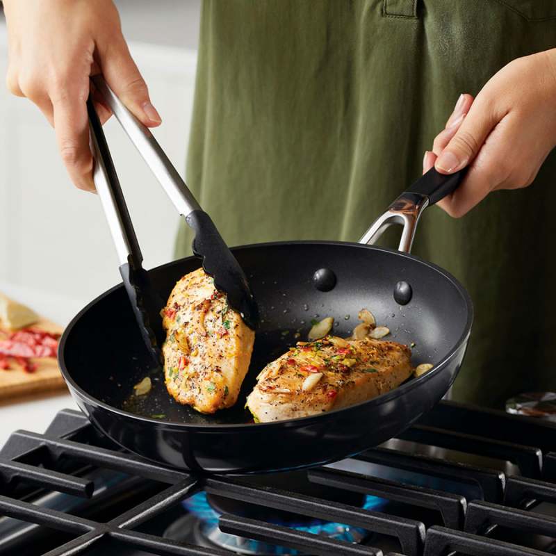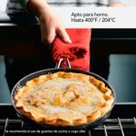 Sartén 25 cm, Negro Onix, elaborado con aluminio anodizado duro, de alta calidad 8 veces más fuerte que el aluminio tradicional, triple capa de antiadherente anodizado duro que cubre incluso los remaches para un rápido desprendimiento de los alimentos y una limpieza sin esfuerzo, permitiendo mantenerla como nueva durante más tiempo. Mango de acero inoxidable con recubrimiento en silicona con doble remache para un agarre seguro, se mantiene frío durante la cocción en la estufa. Hacer un adecuado uso en el horno hasta la temperatura indicada para el producto o parte de este. Apto para cocinas de gas, eléctricas, vitrocerámica y horno hasta 204 °C. No Apta para: - Otros usos diferentes a la cocción y preparación de alimentos. - No exponer a sobrecalentamiento por el uso de los productos con una fuente de calor incompatible o nivel excesivo. - No use productos químicos o limpiadores abrasivos. - Evite el uso de utensilios metálicos o inadecuados con borde afilado.