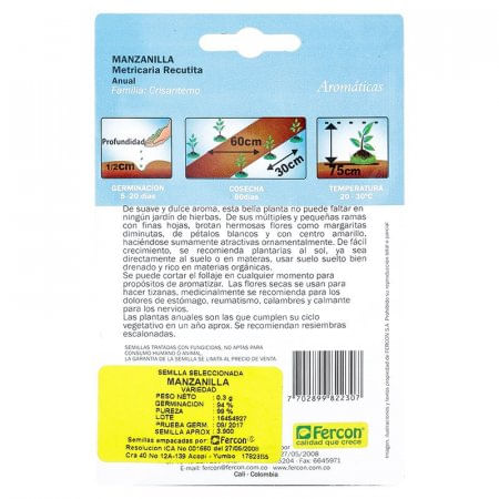 Las semillas de manzanilla que ofrecemos están tratadas con fungicidas, por lo que no son aptas para el consumo humano ni animal. Son semillas aromáticas que producen una planta con un suave y dulce aroma. Se recomienda sembrarlas al sol, directamente en el suelo o en materas. Medicinalmente, las hojas secas de manzanilla son útiles para aliviar dolores de estómago, reumatismo o calambres. Semillas tratadas con fungicidas No aptas para consumo humano o animal Aromáticas, de suave y dulce aroma Recomendadas para plantar al sol, ya sea directamente en el suelo o en materas Las hojas secas tienen usos medicinales para aliviar dolores de estómago, reumatismo y calambres Presentación en sobre.
