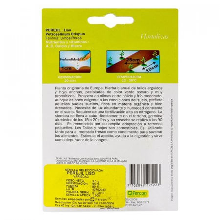 Semillas de perejil liso: Germinación: De 20 días. Temperatura: De 15-30°C. Origen: Europa. Características: Los tallos y hojas son comestibles. Es utilizado tanto para el mercado fresco como condimento para sazonar los alimentos. Estimula el apetito, ayuda a la digestión y sirve como depurador de la sangre. Registro ICA 01660. Elaborada en Colombia. Esta marca te ofrece un amplio catálogo con productos de necesidad, confiables y duraderos, que podrán convertirse en tus aliados a la hora de realizar tus actividades diarias sin problema alguno. Medidas: 1x9x15 Peso: 0.1