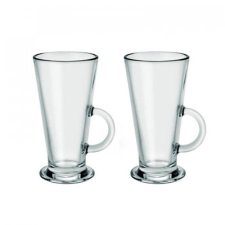 Set de 2 mug Conic Milk marca Borgonovo italiana, fabricada en vidrio 30% más resistente, más brillante y más transparente, ideal para servir cacuchino, te, cafe o postres. Apto para lavavajillas y horno microondas.