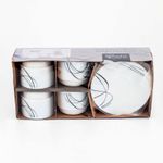 Set de café 8 Piezas Lineas negras Marca: Expressions Tabletops. Capacidad Taza: 250ml. Diámetro plato: 15,3 cm. Material: Vitroceramica. Atributos adicionales: Resistencia a la rotura y al desconchado, al choque térmico y a los arañazos. Apto para lavavajillas y microondas. Cumple con la seguridad alimentaria,0% de porosidad, 0% de bacterias. Respetuoso con el medio ambiente,100% reciclable. Más delgado, de bajo peso, fácil de almacenar.