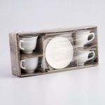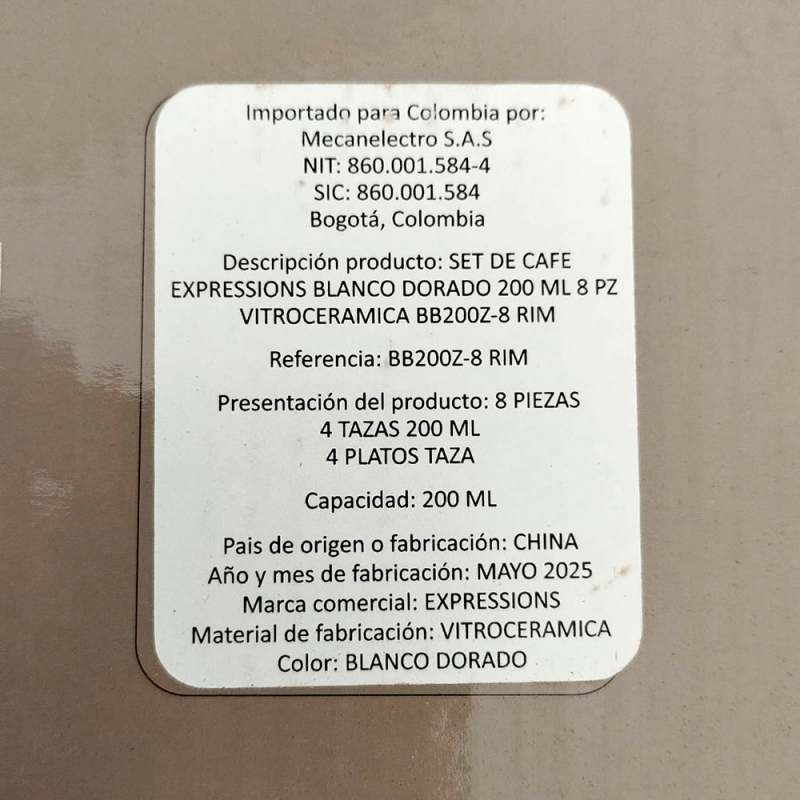 Set Cafe Expressions Dorado Blanco 200 Ml 8 Pz Vidrio Opal BB200Z-8 RIM Set Café 8 piezas: 4 platos de 14 cm , 4 pocillos de 200 ml. Color Blanco con borde dorado Fabricados en vidrio opal (vidrio templado) no poroso. Diseño elegante, apto para lavavajillas.