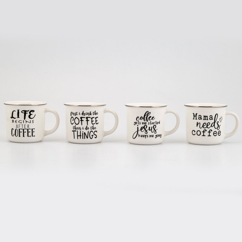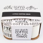Set de Mugs 4 Piezas Expressions Material: Cerámica Diseño: I love Coffee Color: Blanco Incluye: 4 Mugs Capacidad: 355ml Apto para lavaplatos Apto para horno microondas Los productos marcados como 'PRODUCTO SURTIDO' pueden no ser idénticos a los que aparecen publicados en las imágenes. Las imágenes son ilustrativas. Al comprar un producto identificado como producto surtido, aceptas que podrás recibir un producto con características y atributos tangibles diferentes a los que aparecen en las imágenes del sitio o la publicidad. Los productos surtidos mantendrán las propiedades físicas, químicas y técnicas necesarias para su funcionamiento y uso de acuerdo a su naturaleza.