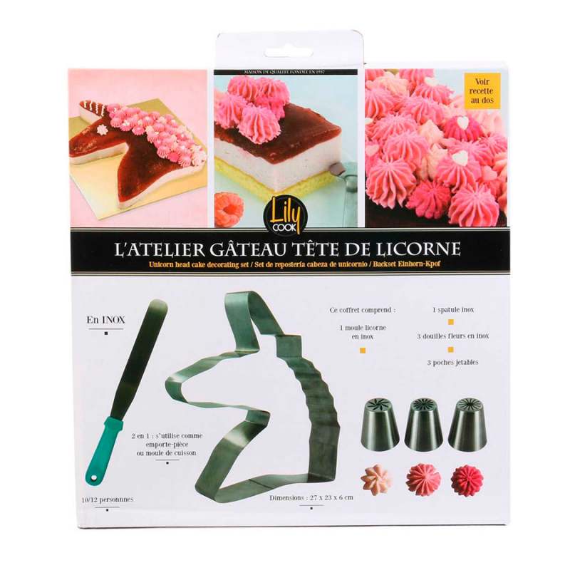 Set de reposteria lily cook molde+boquillas+espatula en acero inoxidable kp5546. ¡Los unicornios están de moda!, este recipiente con molde preformado te permitirá impresionar a tus invitados. Diseño de cabeza de unicornio, contenido: 1 molde de unicornio, 1 espátula, 3 fundas flor de acero inoxidable. 3 bolsillos desechables, 2 en 1 puede utilizarse como molde para galletas o para hornear. Dimensiones: 27x23x6 cm. es molde para 10/12 personas - composición: acero inoxidable.