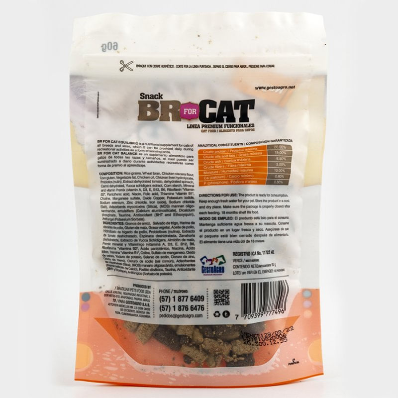 Br For Cat Nuggets Balance Es Un Suplemento Alimenticio Para Gatos De Todas Las Razas Y Tamaños El Cual Puede Ser Suministrado A Diario Durante Actividades Recreativas Como Forma De Premio Al Aprendizaje. Granos De Arroz, Salvado De Trigo, Harina De Vísceras De Pollo, Gluten De Maíz, Grasa Vegetal, Aceite De Pollo, Hidrolizado De Hígado De Pollo, Probióticos (Nulina), Extracto De Tomate Deshidratado, Espinaca Deshidratada, Zanahoria Deshidratada, Extracto De Yucca Schidigera, Almidón De Maíz, Premix Mineral Y Vitamínico (Vitamina A, D3, E, B12, B6, Riboflavina “Vitamina B12”, Ácido Pantoténico, Niacina , Ácido Fólico, Tiamina “Vitamina B1”, Colina, Sulfato De Manganeso, Oxido De Cobre, Yodado De Potasio, Selenio De Sodio, Cloruro De Zinc, Oxido De Hierro), Cloruro De Sodio (Sal Común), Adsorbentes De Micotoxinas (Silica), (Mos) Manano Oligosacárido, Emulsionantes (Aluminosilicato De Calcio), Fosfato Dicálcico, Taurina, Antioxidantes (Bht Y Etoxiquin), Antifúngico (Sorbato De Potasio).