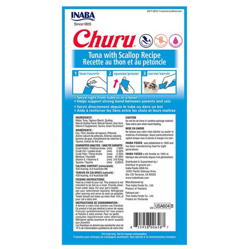 ¡Estos snacks para gatos sabrosos y bajos en calorías se hacen con atún capturado en aguas profundas! Hechos con atún silvestre Sin cereales, conservantes ni colorantes artificiales Textura cremosa y sabores sabrosos que encantan a los gatos ・Ideales para tomar junto con medicamentos Alto contenido de humedad necesario para la salud general de los gatos Bajo en calorías Diseñados para dar de comer con la mano Manera innovadora e interactiva de pasar el tiempo juntos Contenido Neto: 56 Gramos Vienen 4 sobres individuales cada uno por 14 gramos