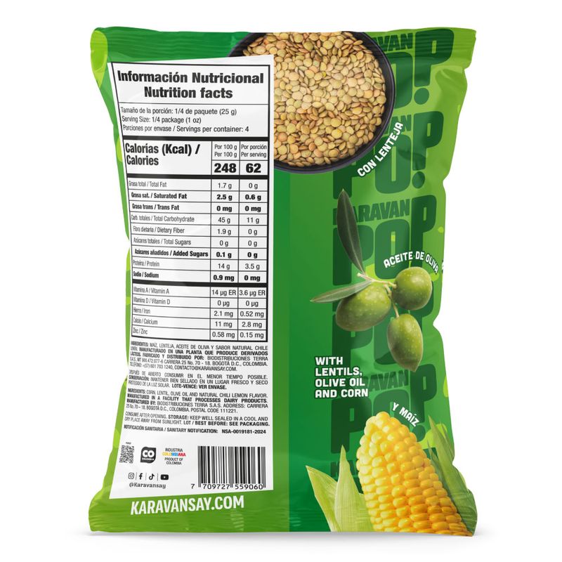 Snack crocante elaborado a base de maíz y lenteja, sin freír. Ofrece una textura ligera y un agradable toque picante, ideal como aperitivo saludable para cualquier momento del día. Conservación: Mantener en lugar fresco y seco