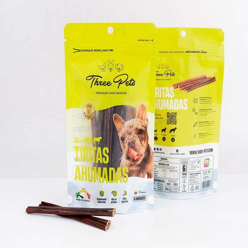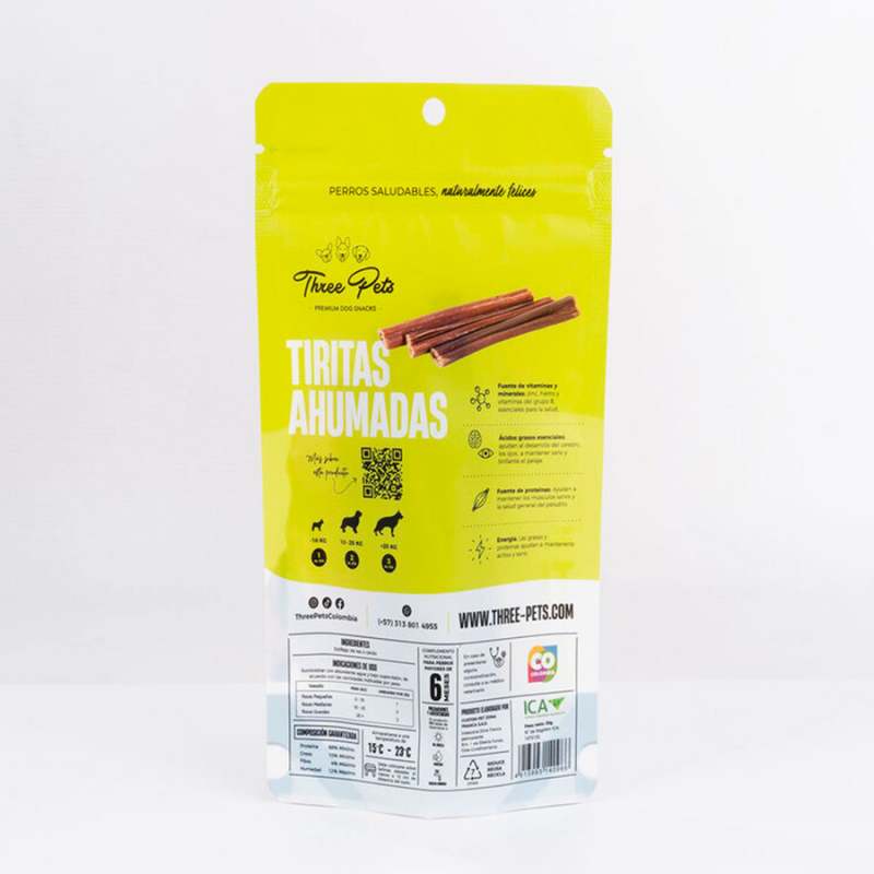 las tiritas Ahumadas de three pets son hechas de los esófagos de res. Ayudan a la salud dental y mantendrán a tu perro entretenido durante horas. Por su alto contenido proteico ayuda la formación de las células y su regeneración.