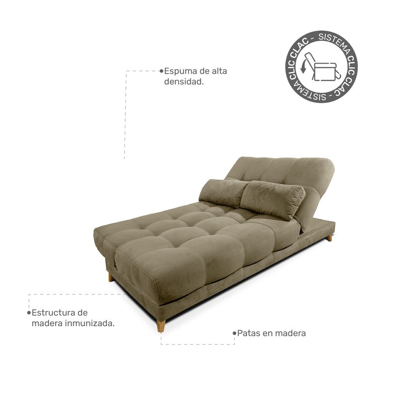 Sofá cama con diseño funcional 5 posiciones. Ideal para optimizar tus espacios. Tapizado en microfibra de excelente calidad, con descansa brazos tipo cojín siliconados. Máximo confort gracias a la composición de sus espumas. Patas en madera.