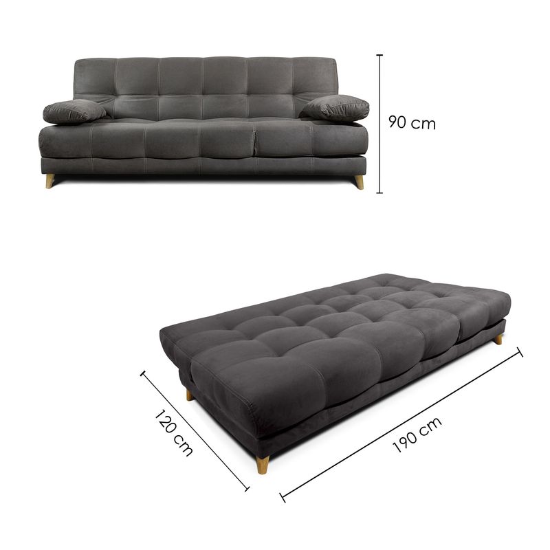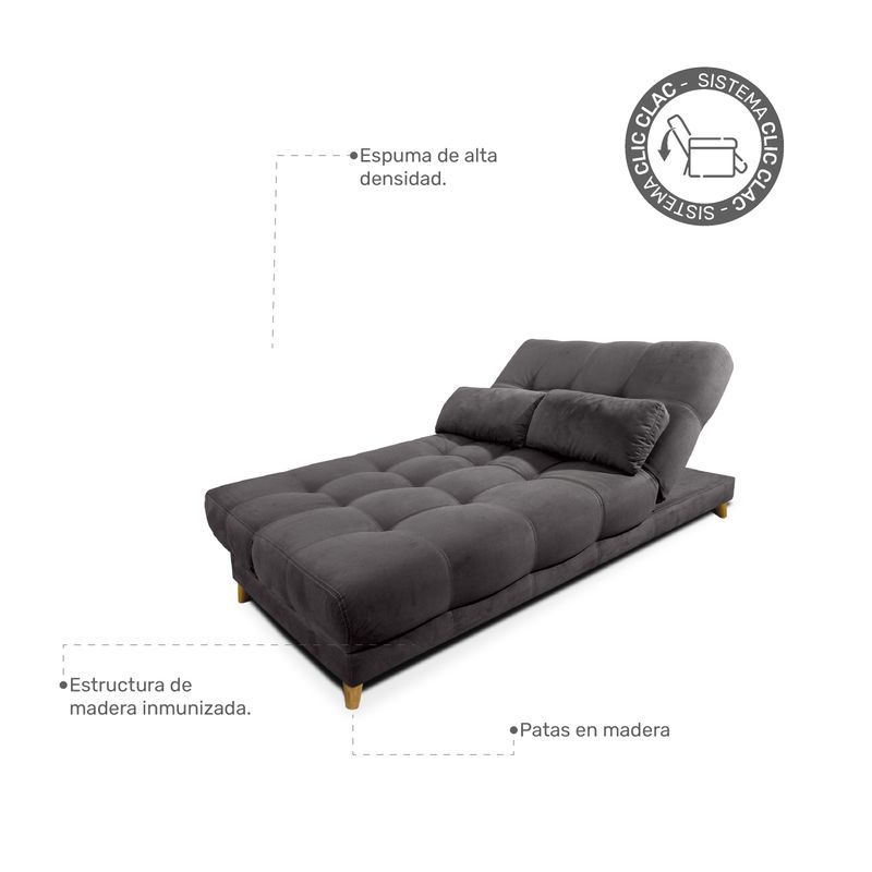 Sofá cama con diseño funcional 5 posiciones. Ideal para optimizar tus espacios. Tapizado en microfibra de excelente calidad, con descansa brazos tipo cojín siliconados. Máximo confort gracias a la composición de sus espumas. Patas en madera.