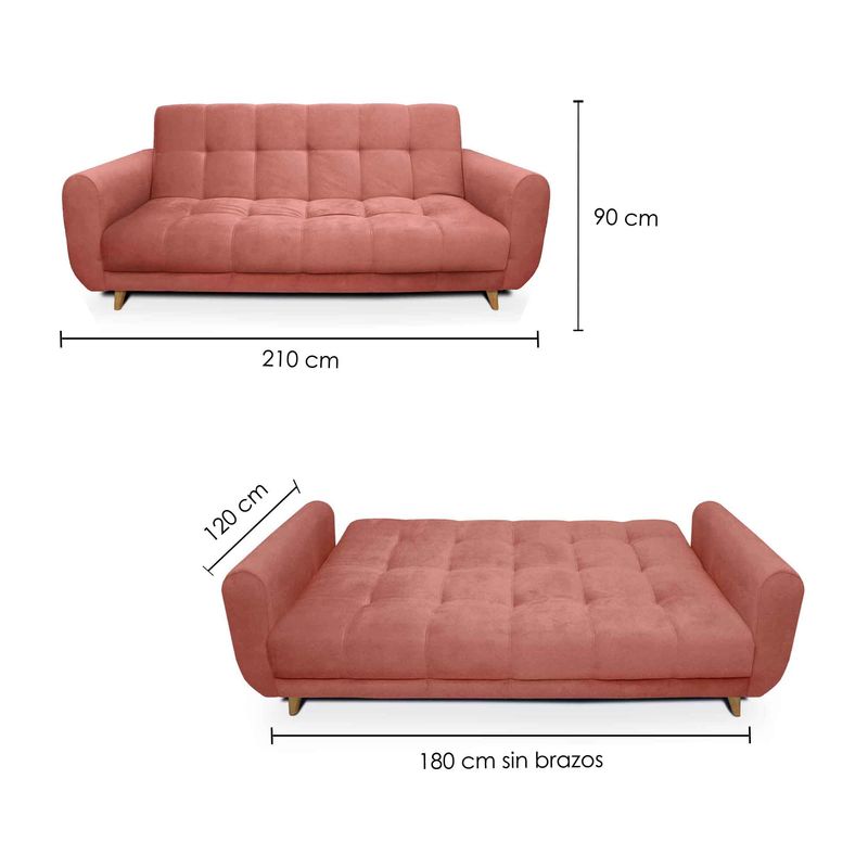Sofá cama con diseño funcional. Ideal para optimizar tus espacios y conseguir el máximo confort, tapizado en tela tipo piel de durazno suave al tacto. Con brazos independientes tipo cojín siliconados y patas en madera.