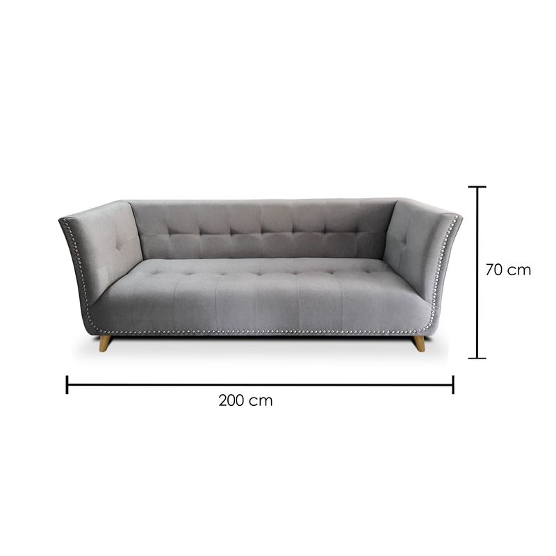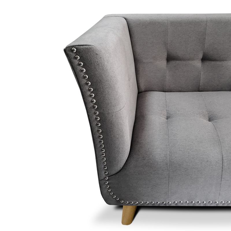 Sofá con un hermoso diseño, ideal para decorar tus espacios. Sin duda, le dará a tu hogar un aire de distinción y elegancia. Contiene detalles refinados y de gran sofisticación como su tela tipo lino, estoperoles y patas en madera.