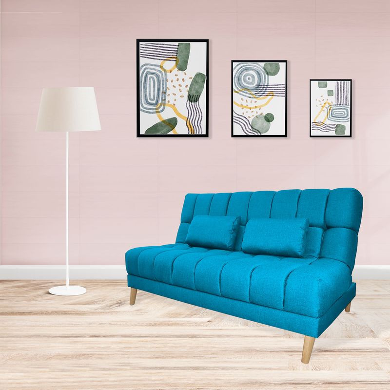 Sofá cama firme de gran confort, excelente soporte, 5 posiciones, tapizado en tela tipo Lino color Turquesa, patas en madera con antideslizante, estructura en madera Pino-inmunizada y espuma de alta densidad.