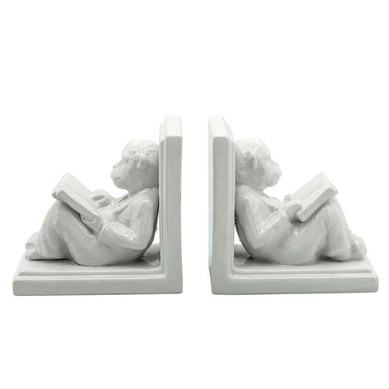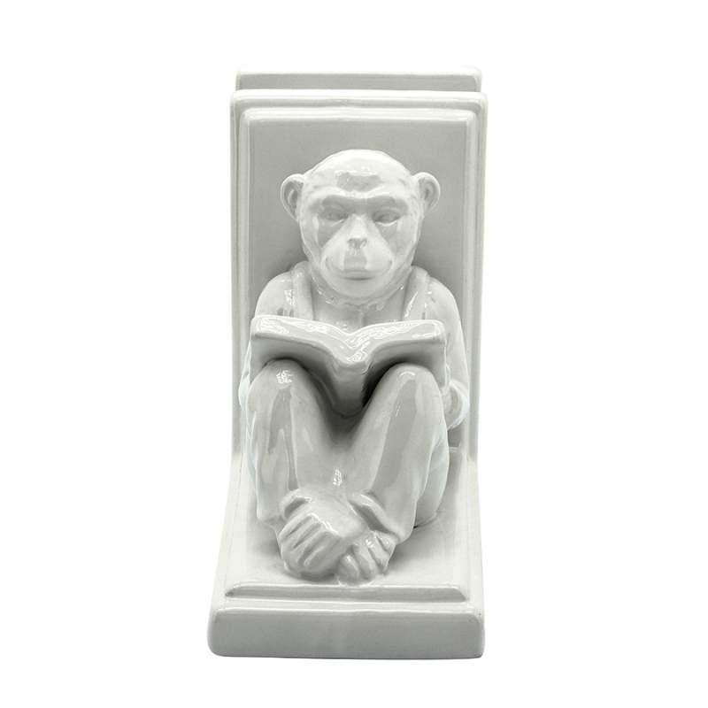 sujetalibros decorativo 15080 con estilo de monos leyendo 17cms set x2 en ceramica, color blanco