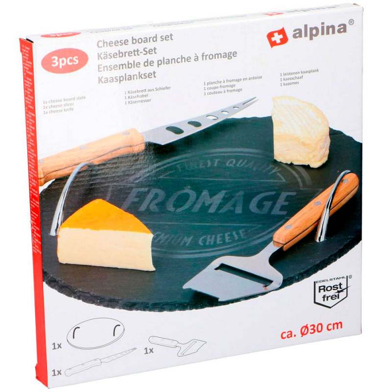 Tabla de quesos 3 piezas. Marca: Alpina. Diametro: 30cm. Material: polipropileno. Peso: 1,2Kg. Atributos adicionales: Diseño ergonomico. Facil de usar. Sirve para servir cualquier tipo de queso. Facil de limpiar.