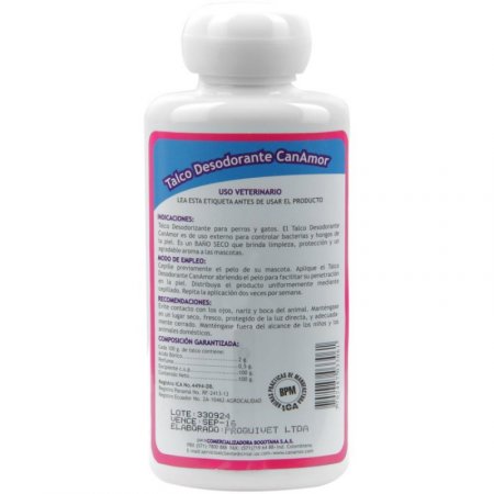 Talco desodorante de uso externo para gatos de todas las razas. Controla bacterias y hongos de la piel. Modo de empleo: Cepillar previamente a la mascota. Aplicar el Talco Desodorante Canamor abriendo el pelo para facilitar la penetración en la piel. Distribuir uniformemente mediante cepillado. Repetir la aplicación cuantas veces sea necesario. Recomendaciones: Evitar contacto con los ojos, nariz y boca del animal. Mantener en un lugar fresco y seco, protegido de la luz solar directa, adecuadamente cerrado y en su envase original. Mantener fuera del alcance de los niños y los animales domésticos. -Material del envase: Plástico -Talco desodorante para gatos de todas las razas. -Antibacterial. -Contenido neto: 100gr. -De uso externo para controlar bacterias y hongos de la piel. -Un baño seco que brinda limpieza y protección. -Agradable aroma de las mascotas. -Uso veterinario.