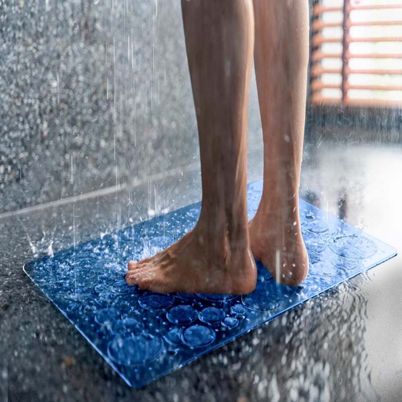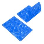 Tapete antideslizante, elaborado en plastico pvc, color azul, contiene cientos de ventosas que lo adieren firmemente al piso, evitando caidas, es resistente a moho, hongos y bacterias, no emana olores. Dimensiones: 43x64cm